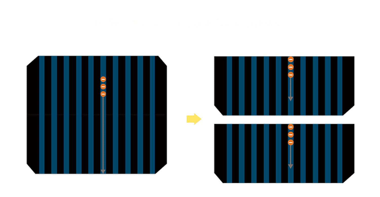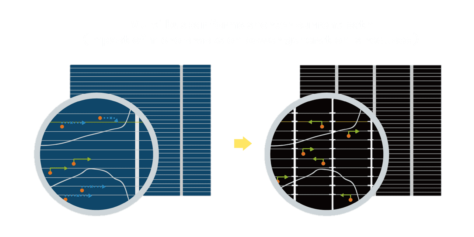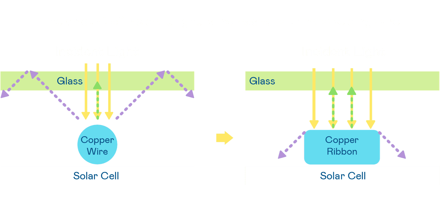 • 电池使用多条铜导线 (Copper wire) 于电池片上形成较短的电流路径,,,提高电流收集效率,,,采用圆形设计的铜导线较传统扁平式的铜焊带 (Ribbon),,,,可增加入射至电池的光线量。。