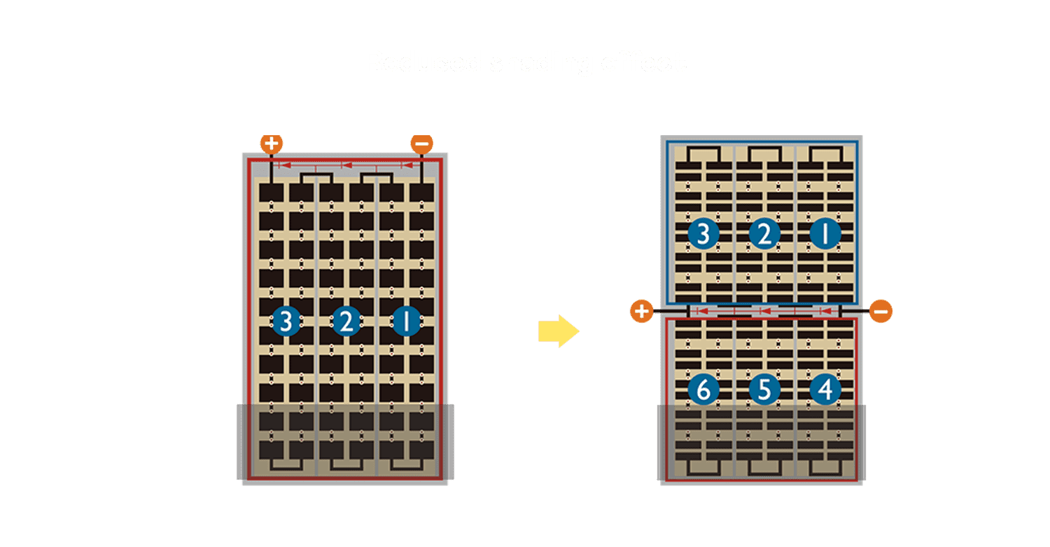 • 结合半切电池,,降低遮阴影响、、、、提升模组抗隐裂能力、、、并减少电阻损耗,,,进一步提升模组发电效能。。